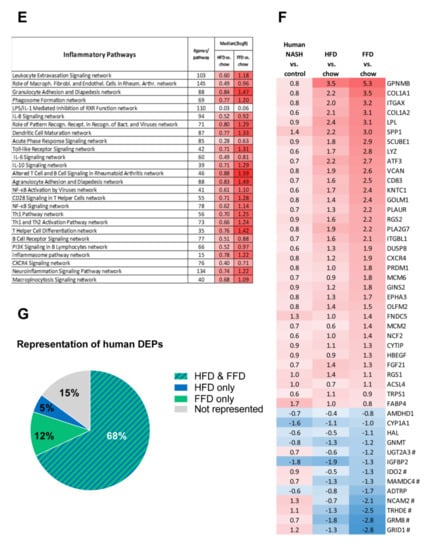 Perhaps even more important than similarity on individual gene level is whether the mice on HFD or FFD mimic human NASH on a pathway level. Thereto, the differentially expressed pathways that distinguish NASH patients from controls were analyzed for the mice on both diets as well. Of the in total 65 differentially expressed pathways identified in humans, 80% were recapitulated on FFD and 73% were recapitulated on HFD. In total, 15% were not represented in mouse livers collected after 28 weeks of diet-feeding and 68% were represented by both diets (Figure 4G). Among the pathways that were represented by both diets were important pathways such as hepatic fibrosis/stellate cell activation, several inflammatory pathways, and also atherosclerosis signaling. For the complete list of pathways and representation thereof on the HFD and FFD, see Supplemental Figure S2.