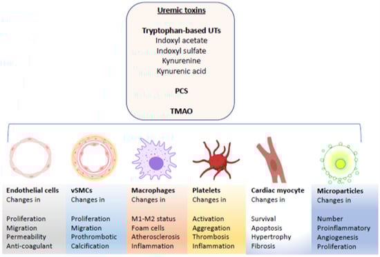 In this review, we will focus on the effects of a set of UTs on various cell types and organs within the cardiovascular system, as well as survey mechanisms by which specific molecules impact such cells. UTs contribute to several cardiovascular pathologies, including accelerated atherosclerosis and neointimal hyperplasia, hyperthrombotic state, abnormal vascular calcification, and microvasculature rarefaction and suppressed angiogenesis (Figure 1) [20,21,22,23,24,25,26,27,28]. Because these pathological processes involve a large array of cells, the following account summarizes the effect of a set of UTs (tryptophan metabolites and TMAO) on various cell types, and how these specific perturbations are integral to CVD pathogenesis in CKD patients.