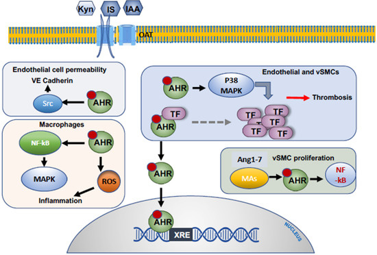 IS also exploits pathways mediated through the stimulation of the MAS1 receptor, a G protein-coupled receptor which binds the angiotensin II (Ang II) metabolite angiotensin-(1-7) (Ang-(1-7)) [72]. Ang-(1-7), by acting via the Mas receptor, exerts inhibitory effects on Ang-II and suppresses inflammation and vascular and cellular growth mechanisms [73]. IS downregulated the Mas receptor in the aorta of normotensive and hypertensive rats [72]. This effect was mitigated by silencing of AHR and NF-κB. Ang (1-7) attenuated IS-induced cell proliferation and TF expression in vSMCs, and exerted this effect through by inhibiting mitogenic signaling cascades such as ERK1/2 and NF-κB [72].
