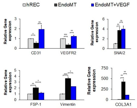 During the pathogenesis of wet AMD, high levels of VEGFA promote CNV and might also suppress EndoMT to allow for efficient neovascularization [16,18]. To determine the effects of VEGFA on EndoMT, EndoMT cells were treated with VEGFA for six days following EndoMT induction, in the absence of pro-inflammatory cytokines, then gene expression was evaluated (Figure 2). This treatment condition models the return to high levels of intraocular VEGFA after a bolus injection of a VEGFA antagonist, as occurs in clinical treatment of CNV [38]. The genes selected for analysis were those that we found to be expressed or suppressed for at least nine days after induction of EndoMT (Supplementary Figure S2).