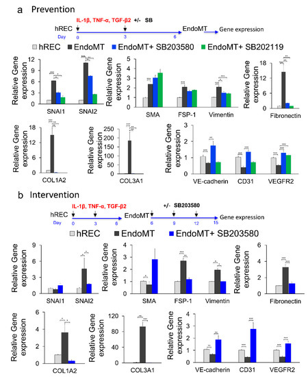 For the prevention study using the p38 MAPK inhibitors, SB203580 or SB202190 (10 μM, Abcam, Cambridge, MA, USA) was applied with the pro-inflammatory cytokines at the beginning of induction and again at day three; expression of endothelial and EndoMT markers was analyzed by RT-qPCR at day six. For the intervention study, SB203580 was added at days six, nine and 12 post-induction, and gene expression was analyzed at day 15. To test responsiveness to VEGFA stimulation, the hREC and EndoMT cells were treated with 10 ng/mL of human vascular endothelial growth factor (VEGFA165) (#8065SF, Cell Signaling Technology, Danvers, MA, USA) for two hours at 37 °C in modified EGM-2 medium (without adding the VEGFA or hydrocortisone included in the bullet kit (Lonza)), then expression of VEGFA-induced genes (VCAM-1, E-Selectin, tissue factor) was evaluated by qPCR.