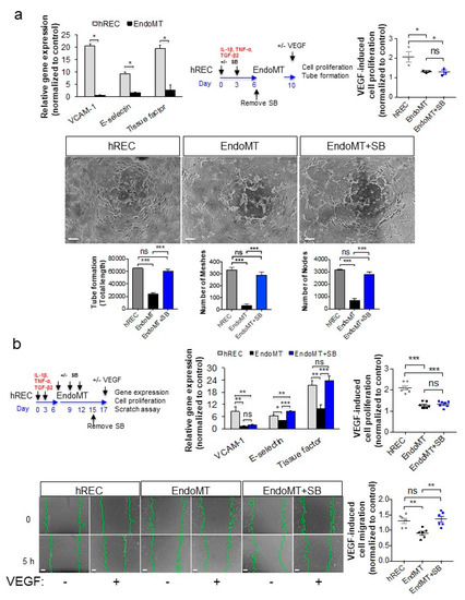 Because SB203580 suppresses EndoMT and re-established expression of the endothelial markers tested, including VEGFR2, we examined whether SB203580 could restore endothelial functions associated with responsiveness to VEGFA stimulation, namely gene expression, cell proliferation, cell migration, and tube/cord formation. In the absence of SB203580 the EndoMT cells treated with VEGFA showed markedly reduced expression of the VEGFA-induced genes encoding VCAM-1, E-selectin and TF after two hours of VEGFA stimulation compared to hREC control (p < 0.05, Figure 4a). These genes were selected for evaluating the responsiveness to VEGFA because they are robustly induced by VEGFA treatment in endothelial cells [44,45,46,47]. The EndoMT cells also displayed reduced cell proliferation and tube/cord formation in response to VEGFA, relative to the hREC controls that were plated at the same density (p < 0.05 and p < 0.001, respectively, Figure 4a). Addition of SB203580 from day 0 until day six (prevention study) failed to restore VEGFA-induced proliferation of EndoMT cells at day 10, but the inhibitor did significantly increase VEGFA-induced endothelial tube/cord formation, to levels comparable with those of the control hREC cells (p < 0.001, Figure 4a, bottom graphs).