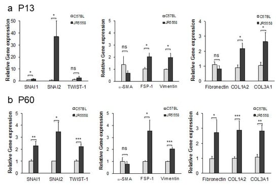 To validate the observation that expression of proteins associated with EndoMT is associated with progression of CNV, mRNA was extracted from the RPE/choroid complex, which contains the CNV lesions, and levels of EndoMT markers were evaluated by semi-quantitative real-time PCR. The genes encoding the EndoMT-associated transcription factors SNAI1 and SNAI2 were expressed at significantly higher levels in the RPE/choroid complex from the JR5558 mice at P13, when CNV lesions are starting to form, compared to wild-type controls (p < 0.05, Figure 6a). Genes encoding additional EndoMT markers, namely FSP-1, vimentin, COL1A2, and COL3A1, were also expressed at significantly higher levels in the JR5558 mice compared to wild-type controls (p < 0.05). The RPE/choroid complex containing older, more-established CNV (P60) yielded significantly higher levels of mRNA encoding SNAI1, SNAI2, TWIST-1, FSP-1, vimentin, fibronectin, COL1A2, and COL3A1 compared to wild-type controls (p < 0.05 to p < 0.001); levels of α-SMA mRNA were not significantly different (Figure 6b), consistent with the patchy staining data noted above. Together, these data suggest that persistent and often progressive EndoMT and fibrosis are associated with CNV growth in the JR5558 mouse. It is important to note that the real-time PCR data cannot distinguish EndoMT from epithelial–mesenchymal transition (EMT), and that EMT of RPE/choroid together with EndoMT likely contribute to the fibrotic changes detected in Figure 6.