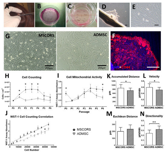 Isolation and cultivation of MSCORS compared to ADMSC. Hair follicles were plucked from the human scalp of five healthy donors (n = 5) in double harvesting sessions of 60 hairs per session (A), shortened distally and proximally, washed (B), and explanted on a Transwell membrane (C). From day 3 to day 24, cells migrated out from the ORS and formed a cell monolayer with a colony-like structure (D). Upon reaching confluence, the ORS cell monolayer was subcultured in flasks (E). (F): The ORS cell monolayer was positive for CD44 (red) with intensive expression at the outer ORS edge. (G): After subcultured in a flask, MSCORS displayed an MSC-like morphology similar to ADMSC. Serial cell subcultures of MSCORS and ADMSC over 1–6 passages, with cell counting (H) and projected cell yield (I) in each passage, correlated with cell mitochondrial activity (J). Cell migration of MSCORS and ADMSC, including accumulated distance (K), velocity (L), Euclidean distance (M), and directionality (N). Data are shown as mean ± SD (* p < 0.05, ** p < 0.01) (n = 5), with unpaired t-test or nonparametric Mann–Whitney test. Scale bar corresponds to 200 μm; magnification (A) 2×, (E,F) 10×, and (G) 4×.