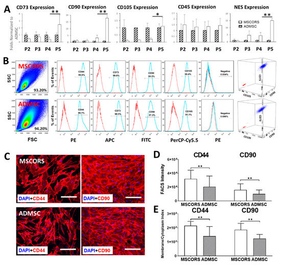 Phenotype of MSCORS compared with ADMSC. (A): qRT-PCR showing the relative gene expression of CD73, CD90, CD105, CD45, and NES of MSCORS against ADMSC from passage 2 to passage 5 (n = 5). HTRP-1 was used as the internal reference. (B): Flow cytometer analysis of surface marker expression on MSCORS and ADMSC. Cells from passage 3 to 5 were labeled with antibodies against human antigens CD44, CD73, CD90, CD105, and MSC-negative marker combination (CD45/CD34/CD11b/CD19/HLA-DR). Representative plot graphs and histograms are shown with antibodies (blue) and isotype control (red). (C): Expression of CD44 and CD90 in MSCORS and ADMSC (n = 5). CD44 and CD90 display varied overall intensity and different subcellular distribution. (D) Expression of CD44 and CD90 analyzed from FACS signal intensity. (E) Membrane/cytoplasm index of CD44 and CD90 expression intensity in MSCORS and ADMSC. Data are shown as mean ± SD (* p < 0.05, ** p < 0.01) (n = 5). Scale bar corresponds to 200 μm; magnification (C) 10×.