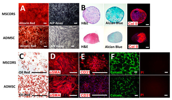 As an essential part of the ISCT characterization panel for MSC classification, capacity for adipo-differentiation, chondro-differentiation, and osteo-differentiation was validated in MSCORS with ADMSCs as a control. Additionally, capacity to differentiate into smooth muscle and endothelial cells has also been demonstrated.