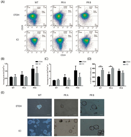 - Asselin-Labat, M.L.; Shackleton, M.; Stingl, J.; Vaillant, F.; Forrest, N.C.; Eaves, C.J.; Visvader, J.E.; Lindeman, G.J. Steroid hormone receptor status of mouse mammary stem cells. J. Natl. Cancer Inst. 2006, 98, 1011–1014. [Google Scholar] [CrossRef]