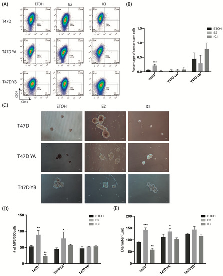 - Raffo, D.; Berardi, D.E.; Pontiggia, O.; Todaro, L.; de Kier Joffe, E.B.; Simian, M. Tamoxifen selects for breast cancer cells with mammosphere forming capacity and increased growth rate. Breast Cancer Res. Treat. 2013, 142, 537–548. [Google Scholar] [CrossRef]