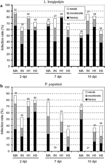 Development of Leishmania hybrids in Lutzomyia longipalpis and Phlebotomus paptasi. Infection rates and density of Leishmania major (MA), Leishmania infantum (IN), hybrid LEM4891 (H1) and hybrid LEM4833 (H3) in sand fly midgut on days 2, 7 and 10 p.i. Infections were classified into three categories: heavy (more than 1000 promastigotes per gut) – black bars, moderate (100-1000) – grey bars, light (1-100) – white bars. Numbers above the bars indicate the number of dissected females. (a) Development in L. longipalpis: the infection rate and the intensity of infection did not differ between Leishmania strains studied. (b) Development in P. papatasi: on days 7 and 10 p.i., the infection rate and the intensity of infection significantly differed between L. major, hybrids and L. infantum. Reprinted from Volf et al. [68] with permission from Elsevier.