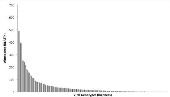 Rank abundance analysis of BLASTn output. This plot was generated from identifications made by comparison of the 454-sequence dataset against the non-redundant viral genome database. Each bar along the X-axis represents a particular viral genotype and the Y-axis indicates the number of representative sequences identified.