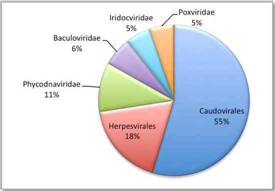 All sequences (69,162), were compared to the non-redundant viral genome databases, using a BLASTn algorithm, and in accordance with MEGAN recommendations [39], relaxed alignment parameters were used for the BLAST search. Of the 69,162 sequences generated from the 454 output, 42,715 sequences provided hits from the BLASTn search. These results were then loaded into MEGAN and the lowest common ancestor (LCA) algorithm assigned 20,287 sequences to taxa with 22,428 remaining unassigned. The LCA algorithm has an inbuilt threshold that is sufficiently stringent to reduce the chances of generating false identities, hence the assignment of the sequences to taxa is both reliable and conservative. Of the assigned sequence reads, 19,010 (93.7%) were identified as dsDNA viruses (Figure 4), of which 10,525 (55.3%) belonged to the Caudovirales; 3,459 (18.2%) Herpesvirales; 2,034 (10.7%) Phycodnaviridae; 1,197 (6.3%) Baculoviridae; 1,026 (5.4%) Iridoviridae and 1,028 (5.4%) Poxviridae.
