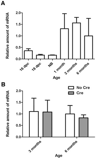 Expression of the Smc1α gene in mouse oocytes. Relative amount of Smc1α mRNA was measured by quantitative real-time PCR as described earlier [10,20]. The error bars represent standard deviations. (A) Relative amount of Smc1α transcript increases in growing wild-type oocytes. Dpc-days post coitum, NB-newborn; (B) Cre-mediated inactivation of Smc1β in Smc1βfl/- mice does not affect the amount of Smc1α mRNA in germinal-vesicle stage oocytes. Analysis of variance by two-way ANOVA showed that effects of genotype or age were not significant (p > 0.2).