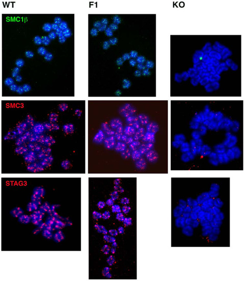 - Novak, I.; Wang, H.; Revenkova, E.; Jessberger, R.; Scherthan, H.; Hoog, C. Cohesin Smc1beta determines meiotic chromatin axis loop organization. J. Cell Biol. 2008, 180, 83–90. [Google Scholar] [CrossRef]