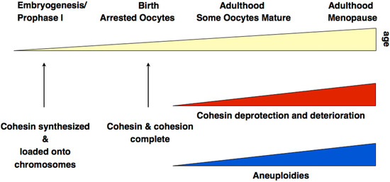 Together, there is now sound evidence from different experimental approaches, which clearly supports the hypothesis of cohesin deterioration as a leading cause for age-dependent oocyte aneuploidies at least in mice. Figure 3 summarizes key insights related to aneuploidies associated with diminished cohesion.