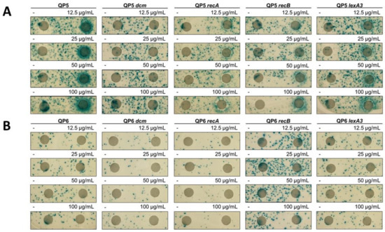 Mutator effect of 5-azacytidine. Disk diffusion assay for Lac reversion using QP5 (A) and QP6 (B) reporters ± dcm, recA, recB, lexA3 and lactose X-gal papillation medium. Each disk on the right was saturated with 5 μL of 5-azacytidine at the indicated concentrations. The control disk on the left was spotted with 5 μL of water.