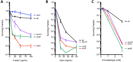 Survival curves. Survival of MG1655 (wt), dcm, recA, recB, and lexA3 strains exposed to 5-azaC (A), ciprofloxicin (B) or formaldehyde (C). MG1655 strains were grown to exponential phase and then treated with drug for 2 h. Each point represents the mean survival of three to five biological replicates with error bars indicating the standard error of the mean. (wt: black, dcm: blue, recA: red, recB: green, lexA3: purple). Orange dotted lines indicate the doses used in the mutation rate assays.