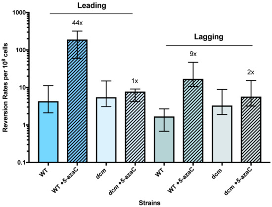 Reversion rates of lacZ QP alleles using leading and lagging strand reporters. Data shows reversion rates per 108 cells from at least 6 multiple trials performed in different days of wild-type and dcm null strains. Rates are: 4.3, 5.5, 1.7, and 3.3 respectively. Rates of leading and lagging strand reporters with treatment with 12.5 µg/mL of 5-azacytidine are 190, 7.8, 20, and 5.7. Fold change comparing rates of reversion with and without exposure of 5-azacytidine is indicated above bars, and are 44, 1, 12 and 2, respectively.
