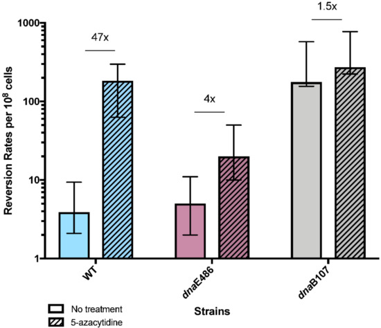 The dnaB107 allele likewise causes temperature-sensitive DNA replication. At its permissive temperature, dnaB107 mutants show elevated rates of genetic recombination [38], genomic rearrangements [18,19] and increased fork regression [39], suggesting that the mutant helicase is prone to dissociation from the fork. In the dnaB107 mutant, at its permissive temperature of 30 °C, constitutive rates of reversion measured with QP5 were greatly elevated, 41-fold higher than wt strains (Figure 6). Rates after 5-azaC treatment were only slightly higher, at 1.5 above baseline rates.