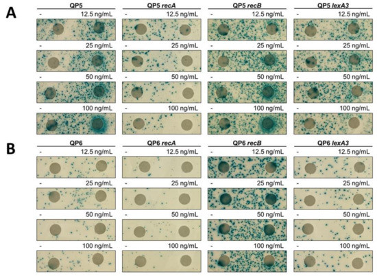 Mutator effect of ciprofloxacin. Disk diffusion assay for Lac reversion using QP5 (A) and QP6 (B) reporters ± recA, recB, lexA3 and lactose X-gal papillation medium. Each disk on the right was saturated with 5 μL of ciprofloxacin at the indicated concentrations. The control disk on the left was spotted with 5 μL of water.
