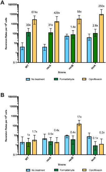 Comparison of reversion rates of lacZ QP leading (QP5) and lagging strand (QP6) mutational reporters after treatment with formaldehyde and ciprofloxacin. Data show reversion rates per 108 cells from at least 6 multiple trials performed in different days. Error bars represent 95% confidence intervals. Reversion rate of lacZ wild-type and mutant reporters after exposure of 25 ng/mL of ciprofloxacin and 1 mM of formaldehyde. (A) Rates for QP5 reporters are 4.3, 140, 2900, 4.2, 130, 1800, 57, 82, 3300, 40, 110, and 10,000. Fold change comparing rates of reversion with and without exposure are 33, 674, 31, 429, 1.4, 58, 2.8, and 250 respectively. (B) Rates for QP6 reporters are 2, 2, 3.4, 4.7, 2.4, 2, 9.6, 3.8, 160, 7.8, 0.9, and 1.3. Fold change comparing rates of reversion before and after exposure are 1, 1.7, 0.5, 0.4, 0.4, 17, 0.1, and 0.2, respectively.