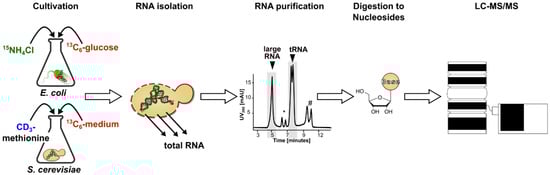 In the central dogma of molecular biology, messenger RNA (mRNA) is the molecule linking the genetic code, DNA, with the cellular work force, proteins. mRNA is translated into proteins with the help of transfer RNA (tRNA) and ribosomal RNA (rRNA). In addition to these key players, many other RNA species have been identified such as long non-coding RNAs (lncRNAs), micro RNAs (miRNAs) or even enzymatic RNAs like RNase P []. For over half a century, it is known that tRNAs are post-transcriptionally modified []. These modified nucleosides and the enzymes involved in their generation are crucial to cell homeostasis. Gene defects of RNA modifying enzymes lead to complex diseases, commonly neurological diseases (for review see [,]). The modification status of other RNA types was undefined for a long time. With the development of more sensitive mass spectrometric tools and sequencing methods, the modification status of single RNAs or the whole transcriptome became accessible [,,]. Modification mapping by sequencing is an indirect tool, which uses signals like reverse transcription stalling or stops to detect a modification []. Thus, it cannot clearly assign the chemical identity of the detected modification and rigorous validation is necessary []. The chemical identity of a modified nucleoside is determined by mass spectrometry. Mass spectrometry relies on the purification of the RNA of interest followed by a complete or partial digestion. Partial digestion with RNases like RNase T1 leads to the formation of short oligonucleotide stretches and the identity and sequence context of a modification can be determined []. Here, several micrograms of purified RNA are necessary. Usually such quantities are not available, especially for low abundant RNAs such as miRNAs or defined mRNAs. Here, only nanogram amounts of purified target RNA are available and subjected to complete enzymatic digestion to the nucleoside building block. Nucleoside analysis has the advantage of unparalleled sensitivity and the detection of some modified nucleosides is possible down to amol quantities. Thereby, the modification profile of low RNA amounts can be determined but at the price of the lost sequence context []. Another drawback of mass spectrometry is the non-quantitative nature of the technique. The detection efficiency of an analyte depends on many, partly non-controllable, factors in mass spectrometry []. These lead to signal fluctuations, and thus a reliable and absolute quantification is not possible. To overcome this obstacle, stable isotope-labeled compounds have been utilized as internal standards. Here, heavy isotopes like carbon-13, nitrogen-15 or oxygen-18 are used to produce the analyte of interest. These heavy isotopologues of the target analyte have the same physico-chemical properties as the analyte and thus they can be used to correct for mass spectrometric detection fluctuations. The use of deuterium (D) is also possible, but here some physico-chemical properties vary (e.g., retention time) and thus D-labeled isotopomers are not ideal as internal standards []. The production of a heavy labeled compound can be done either synthetically [] or by metabolic labeling []. In many fields, metabolic isotope labeling for production of stable isotope-labeled internal standards (SILIS) is established [,,]. For the analysis of modified nucleosides of RNA, Kellner and Helm established metabolic SILIS production in 2014 []. Here, the generation of 11 modified nucleosides, mainly from tRNA, was presented. Since then, the technique has found wide distribution in the field of nucleic acid modification analysis [,,,]. With the use of SILIS, mass spectrometry is now a sensitive, selective and accurate tool for modern analysis and quantification of RNA modification profiles. While the key concept of the method presented in 2014 was highly valuable to the field, it had several disadvantages. With just 11 modified nucleosides, it was not possible to assess the complete modification landscape of e.g., eukaryotic tRNAs. Major RNA modifications like hypermodified uridines (position 34) or hypermodified adenosines (position 37) could not be quantified with the method. In addition, the original method used total RNA for SILIS production. The modified nucleosides from tRNA were diluted with excess canonical nucleosides from the scarcely modified rRNA. Thus, a high amount of canonical nucleosides was added to the sample through the SILIS, which interfered with ultraviolet (UV) quantification of the canonical nucleosides in the sample.