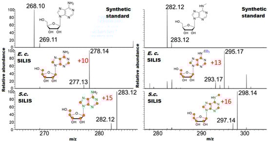 The mass spectra of adenosine (left) and 6-methyladenosine (m6A, (right)) are shown for the synthetic standard, the E. coli stable isotope-labeled internal standard (E. c. SILIS) and S. cerevisiae SILIS (S. c. SILIS). Atoms that were stable isotope labeled are indicated in red for carbon-13, blue for deuterium and green for nitrogen-15.