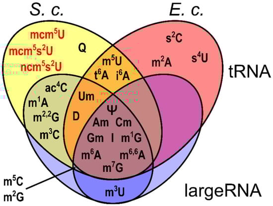 Venn diagram of modified nucleosides, which are produced in the presented SILIS preparation. S. c.: Saccharomyces cerevisiae; E. c.: Escherichia coli. Color code: tRNAs, red and yellow; large RNAs, blue. Red text: Wobble uridines. The full names of the abbreviated modified nucleosides are found in Table 1.