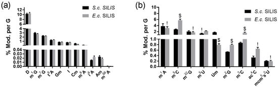 Quantification of modified (Mod.) nucleosides in tRNA from HEK 293T cells using either the S. c. SILIS or the E. c. SILIS. The average of three technical replicates is shown. The error bars reflect the standard deviation. (a) Modified nucleosides that are present in both SILISs. (b) Modified nucleosides, that are only present in the S. c. SILIS and not in the E. c. SILIS. For quantification of nucleosides absent in the E. c. SILIS, chemically similar SILIS analytes ($) or no SILIS analytes (!) (external calibration only) were used as detailed in the text.