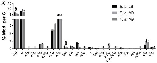 Bacteria contain a vast variety of modified nucleosides and tRNA modifications are especially getting more attention from microbiologists and infectiologists. Only recently, the tRNA modification status of the pathogen P. aeruginosa (PA) was determined []. Unfortunately, no absolute quantification of modified nucleosides was possible in this study. Therefore, we decided to grow P. aeruginosa PA14 in minimal M9 medium and compare the quantity of modified nucleosides with tRNA from LB and M9 cultured E. coli (in stationary growth phase only). In general, we found the same modified nucleosides in E. coli and PA tRNA (Figure 5a). For the modified nucleosides m1G, m2A, m2G, s2C, m5U, m6A, m7G, Cm and I, we found comparable quantities in both bacterial strains. However, we observed a lower abundance of s4U (enzyme: thiI), Gm (TrmH) and Um (TrmJ) in P. aeruginosa. Gm, in bacterial tRNA, is connected to inhibition of TLR7, which results in a suppression of the hosts immune system []. Our data suggests, that PA tRNA might be more immune-stimulatory compared to E. coli tRNA due to the lower abundance of Gm. TrmJ and thus Um on the other hand was shown to be important for oxidative stress survival in PA []. At this point, we cannot predict the impact of these low abundant tRNA modifications in PA, but we are confident that future studies will address these findings. Overall, bacteria show a very low modification density in their tRNAs. The absolute quantities are given in Supplementary Materials Table S5b.