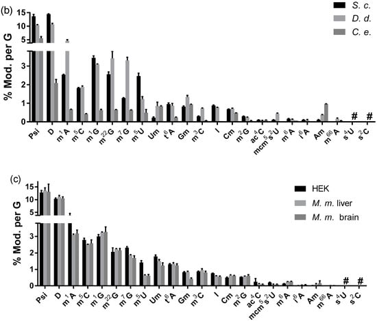 In a next step, we applied our yeast tRNA SILIS to assess the modification profile of tRNAs from increasingly complex eukaryotes. We analyzed S. cerevisiae, D. discoideum, C. elegans, the human cell culture strain HEK 293T and tissue samples from adult mice (here liver and brain). The results are shown in Figure 5b,c and are listed in Supplementary Materials Table S5b. In comparison to the modification profile of E. coli and PA in Figure 5a, we see a higher variety and abundance of modified nucleosides in the eukaryotic samples. This is in accordance with the literature []. For the fungus S. cerevisiae and the amoebozoa D. discoideum, we only observe minor differences in the total abundance of modified nucleosides. One of the most interesting organisms in our analysis is C. elegans. C. elegans has a similar chemical variety of modified nucleosides as the other eukaryotes, but the abundance is lower compared to the other eukaryotes. The only exception are the ribose methylated nucleosides Um, Gm and Cm, which are of comparable abundance or even increased abundance in the worms (Am). From our data, many hypotheses are possible. For example, the tRNA maturation and modification might be less efficient in the worm and thus more tRNAs remain as unmodified transcripts. It is also possible, that worms contain large quantities of an unknown transcript of 60–100 nucleotide lengths, which is heavily modified with ribose methylation. We are currently investigating why worms display such a bizarre modification profile. Our analysis of the human cell culture samples and the mouse tissue samples revealed an overall high similarity between the sample types. From our data, we observe the previously reported lower abundance of m2G, m1G and m22G in mouse brain compared to mouse liver samples. In addition, we can confirm the comparable abundance of m1A and t6A in the tRNAs from these tissues []. Furthermore, we see a reduced abundance of Gm and Um in the mouse brain tissue compared to liver.