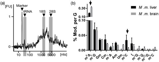 Absolute quantification of mRNA purified from mouse liver and mouse brain. (a) The chip electropherogram of mouse brain mRNA shows the expected size distribution from 500–7000 nucleotides. The location of tRNA and ribosomal RNA (18S and 28S) are indicated in grey. (b) Modified nucleosides found and quantified in mouse mRNA from brain and liver. Legend: Arrow: Most interesting differences between liver and brain tissue mRNA. *signal detectable but not quantifiable. The average of n = 3 biol. replicates are plotted. The error bars reflect the standard deviation.