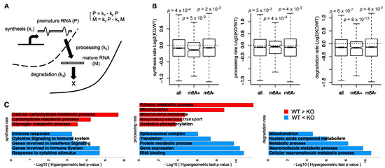 (A) Quantification of the kinetic rates of RNA synthesis, processing, and degradation through mathematical modeling of the RNA life-cycle. (B) Distributions of changes in the kinetic rates between untreated wild type (WT) and knock-out (KO) cells for all modeled transcripts and for the subsets of mA+ and m6A− transcripts; Wilcoxon p-values testing a negative shift of each distribution are reported. (C) GeneOntology (GO) functional enrichment analysis for the top-ranking differential genes for each kinetic rate.