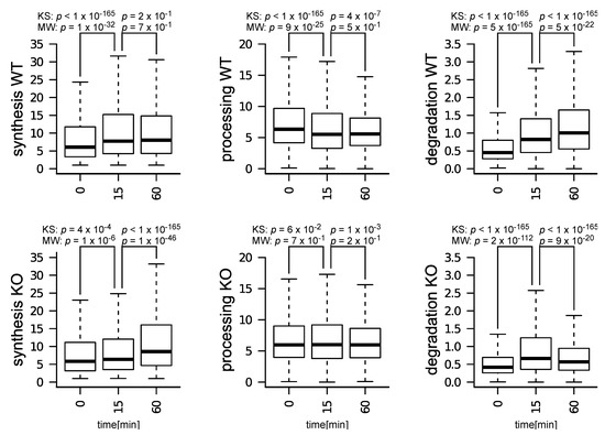 Distributions of synthesis, processing, and degradation rates in WT and KO cells, at: 0, 15, and 60 min after IL-7 induction. The figure shows p-values resulting from the application of the Kolmogorov–Smirnov (KS) and of the Mann–Whitney (MW) tests on each pair of distributions tested.