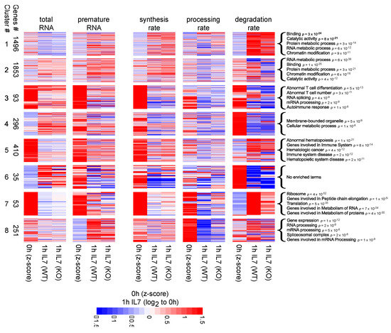 Cluster analysis was used to identify groups of genes with coordinated response to IL-7 in terms of RNA species abundance and RNA kinetic rates (Figure 3).