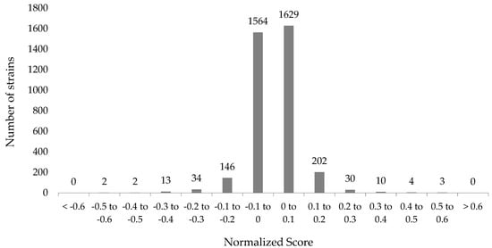 In this work, the chemical genetic screen provided a method for the identification of the non-essential genes that may be involved in Ga resistance or sensitivity. A total of 3985 non-essential genes were screened for growth in the presence of 100 μM Ga(NO3)3 and from here, 3641 hits, in which n ≥ 9, were used for subsequent statistical analyses (Figure 1 and Supplementary Table S1). The statistical cutoff that suggested a significant difference in fitness when compared to the WT, indicated by a change in colony size, was selected to be two standard deviations from the mean or a normalized score of +0.162 and −0.154. This resulted in 107 gene hits, which represents approximately 2.5% of the open reading frames in the E. coli K-12 genome. In general, the normalization was performed with the assumption that hits presenting scores within two standard deviations from the mean had non-specific or neutral interactions with Ga. Therefore, the remaining hits were not regarded as significant based exclusively on the cutoffs selected.