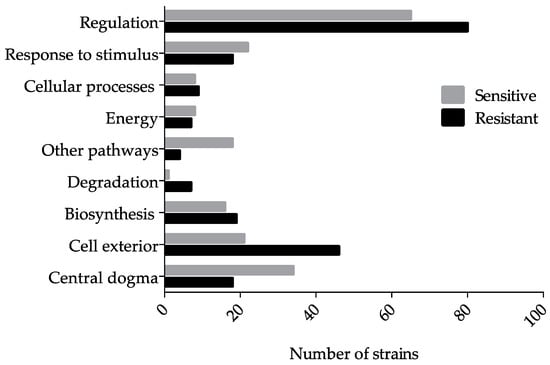 Data mining was performed using Pathway Tools Omics Dashboard, which surveys against the EcoCyc database [39] and Uniport [40]. This allowed for the clustering of the Ga resistant and sensitive data sets into systems, subsystems, and individual objects (Table A1). Here, genes can be found in multiple systems since many are involved in a number of cellular processes.