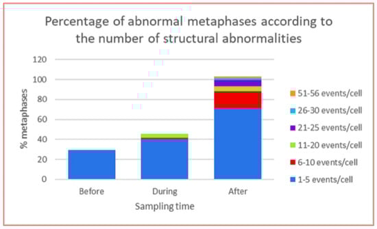 - Ryabchenco, N.; Nasonova, V.; Antoschina, M.; Fesenko, E.; Kondrashova, T.; Ivanova, T.; Pavlov, V.; Ryabikhina, N.; Terekhova, A. Persistence of chromosome aberrations in peripheral lymphocytes from Hodgkin’s lymphoma remission patients. Int. J. Radiat. Biol. 2003, 79, 251–257. [Google Scholar] [CrossRef]