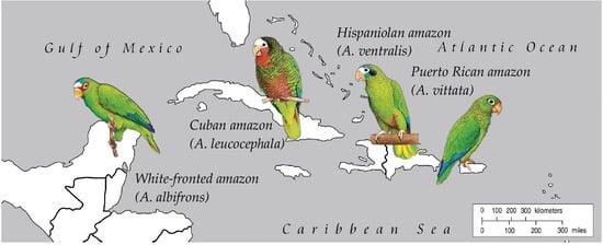 Islands became an important source of evolutionary ideas [,,]. Since Darwin’s Voyage on the Beagle, they provided valuable model systems for fundamental studies of migration, diversification and extinction [,]. Amazon parrots (Amazona sp.) that inhabit the Greater Antillean Islands are a fascinating example of speciation on islands, in many ways similar to that of Darwin’s finches in the Galapagos []. Several attempts have been made in the past to shed light on evolution and speciation of these birds based on morphological [,] and molecular data [] but the picture still falls shy of full resolution. Considering the significance of parrots to these islands’ history and ecology [,,,], we believe it is important to understand how these species came to be and how they adapted to specific island environments. In this article, we focus on the clade of amazon parrots that originated in Central America and spread across the Caribbean islands of Cuba, Hispaniola and Puerto Rico [,].