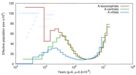 Based on the variation data from the genomes, we estimated population dynamics using the pairwise sequentially Markovian coalescent (PSMC) model []. The PSMC approach uses the coalescent model to estimate changes in population size, which allowed us to create a TMRCA (Time to the Most Recent Common Ancestor) distribution across the genome and estimate the effective population size (Ne) in recent evolutionary history (e.g., from 10,000 to 1 million years). Demographic history was inferred separately for each species using a generation time of six years calculated by the captive breeding program for Puerto Rican parrot [] and mutation rates recently estimated from bird pedigrees available in the literature [].
