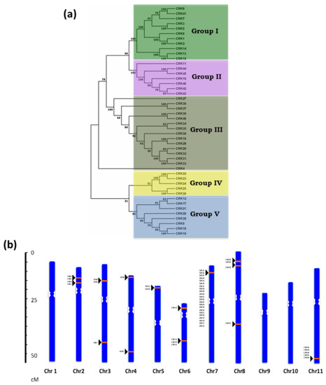 Phylogenetic analysis and chromosomal distribution of Phaseolus vulgaris CRK genes. (a) Protein sequences of 46 P. vulgaris Cysteine (C)-rich receptor-like kinase (CRK) homologs were identified in the Phytozome database. The phylogenetic tree was constructed using MEGA 7 software with the neighbor-joining (NJ) tree method with 1000 bootstrap values. (b) CRK genes localized to Phaseolus chromosomes. The chromosomes are represented by blue bars that are distributed numerically. The orange bands with black triangles indicate the CRK position on the chromosome.