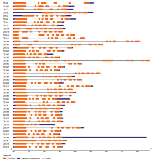Gene structure analysis of Phaseolus cysteine-rich receptor-like kinases (CRKs). The intron–exon structures of PvCRK genes were analyzed using the Gene Structure Display Server (GSDS) database. Exons/Coding sequence (CDS) are represented by orange bars, introns by grey lines, and upstream (5′)/downstream (3′) untranslated regions (UTRs) are blue bars.