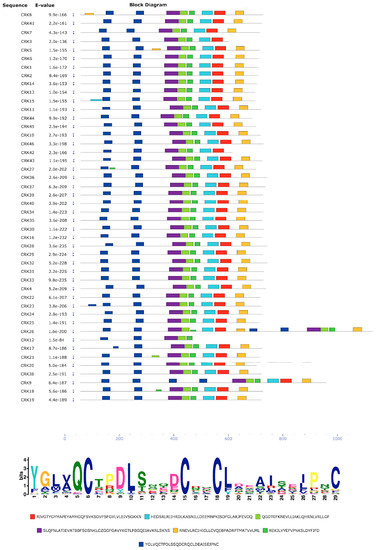 Identification of motifs in CRK protein sequences. MEME was used to identify motifs in the 46 P. vulgaris CRKs. Significantly overrepresented motifs are graphically depicted by bars corresponding to their predicted position. The dark blue bars are analogous to salt stress response/antifungal domain (PF01657), and the corresponding sequence logo is shown in the lower section, in which conserved amino acids are represented by one-letter abbreviations. The red boxes represent kinase domains (PF00069) and light blue represents Pkinase_Tyr (PF07714).