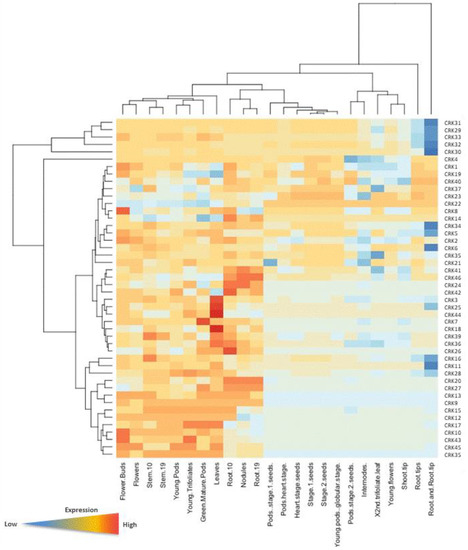 PvCRK genes show differential expression patterns in various vegetative and reproductive tissues of Phaseolus. RT-qPCR analysis of representative CRK genes (based on predominant cis-regulatory elements for light responsive, defense responsive and hormonal responsive elements) in different Phaseolus organs show variable expression patterns and were consistent with the Phytozome transcriptome database. As shown in the results, out of 46 PvCRKs, an average of 50% of genes showed low expression and 22% of genes exhibited high expression in all tissues analyzed. Curiously, CRKs with high expression in most of the tissues belonged to phylogenetic group III, implying their indispensable role in various aspects of growth, development, reproduction and defense in homologues in other plant systems [5,7,11,12,13,14,15,16].