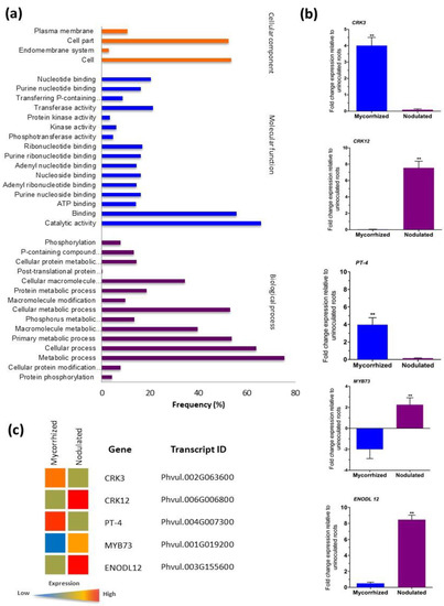 Gene ontology (GO) annotation and RT-qPCR validation of RNA sequencing (RNA-Seq) data from symbiont-colonized P. vulgaris roots. (a) GO term annotation of PvCRKs were summarized in three main GO categories, biological process, molecular function and cellular component. GO enrichment analysis performed using AgriGO and REVIGO platforms. Bars indicates the frequency of genes with the same term. (b) RT-qPCR analysis showing relative expression of Phaseolus CRK3, CRK12, PT-4, MYB73, and ENODL12 genes. Candidate genes were selected and corresponding transcript accumulation under mycorrhized and nodulated conditions was quantified by RT-qPCR. RT-qPCR data are the averages of three biological replicates (n > 9). Statistical significance of differences between mycorrhized and nodulated roots was determined using an unpaired two-tailed Student’s t-test (** p < 0.01). Error bars represent means ± Standard error mean (SEM). (c) Heat map of the transcriptomic data obtained through RNA-Seq showing the expression profiles of CRK3, CRK12, PT-4, MYB73 and ENODL12. Color key in red and blue color represents upregulated and downregulated genes respectively whereas, yellow represents no transcript accumulation.