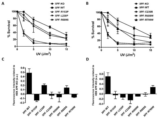 Cell lines expressing the different XPF variants were tested for sensitivity to UVC irradiation. For a better understanding, data were split into two different graphs: Figure 2A includes controls, XPF-R153P (XFE), XPF-L230P (FA) and XPF-R689S (FA) while the second graph (Figure 2B) shows controls, XPF-C236R (CS), XPF-R589W (CS/XP) and XPF-R799W (XP and XFE/CS). All the variants showed increased UVC sensitivity and cells expressing XPF-R153P and XPF-R589W were the most sensitive to UV, similar to XPF-KO (Figure 2A,B). These results are in concordance with the phenotype of the patients where these mutations were identified: XFE progeria patient showed skin photosensitivity and patient’s primary fibroblasts were 10 times more sensitive to UVC [25]. XPF-R589W was found in XP patients and in an XP/CS patient XPCS1CD together with XPF-C236R variant [21,28]. Interestingly, another patient (CS1USAU) with XPF-C236R together with a XPF null allele p.Tyr577* had only the CS phenotype [27]. This could indicate that expression of XPF-R589W is actively causing the XP phenotype in patient XPCS1CD. In line with this hypothesis is the observation that, in our model and in [28], cells uniquely expressing XPF-C236R have mild UVC sensitivity (Figure 2B). A study performed by Popp and colleagues classifies for the first time XPF-R589W as an FA mutation [43]. The patient from which it was identified was presented as an FA clinical phenotype, however, bone marrow failure, one of the crucial features to be classified as FA, was absent. Despite the atypical FA clinical phenotype, it was the first FA patient to develop skin photosensitivity. The second allele of XPF presented a novel splice site mutation (c.793-2A>G) which produced a premature termination of translation (p.Thr265Valfs*13), hence originating a null allele as happened with the previously reported FA XPF variants [35]. Contrary to Hashimoto group, who found the XPF-R589W mutation was abruptly affecting XPF structure and its SLX4 binding [45]. Popp and colleagues detected a residual proportion of XPF-R589W escaping from protein misfolding, able to reach the chromatin [43] as happened with the reported FA XPF variants. The two FA XPF variants, XPF-L230P and XPF-R689S, showed a marked resistance to UVC when compared to XPF-KO (Figure 2A). These results confirmed previous studies which proved that these two mutations do not severely impair XPF to participate in NER of UVC-induced DNA lesions [35]. Interestingly, XPF-R589W mutant studied by [43] had reduced UVC irradiation resistance, and showed higher UVC irradiation resistance levels than XPF-L230P [43]. This combination of findings supports the conceptual premise that there is a link between ICL and NER pathways and endorse the theory that mutations found in specific locations of the sequence should not be associated with discrete DNA repair pathways impairment.