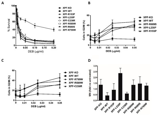 (A) Percentage of surviving cells under increasing doses of diepoxybutane (DEB). The graph represents the mean of at least two independent experiments with two replicates and the SEM. (B,C) Percentage of cells stalled in G2/M phase after DEB exposition. Half of the XPF variants are represented in each graph with the positive and negative controls. Each graph represents the mean of at least two independent experiments with the SEM. (D) Micronuclei (MN) test after DEB (0.01 μg/mL) exposure. Data is represented in fold changed vs. untreated cells. Graph represents the mean of at least three independent experiments with SD.