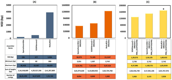 Figure 1. Statistics of the assemblers used in our study for (A) single assembly (in blue), (B) hybrid assembly (in orange), and (C) hybrid assembly with RNA scaffolding (in yellow). The table below the bar chart shows the statistics for each of the assembler(s). The combination of assemblers marked with a star (*) was used for our analysis.