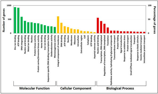 From the BLASTx results, we observed that out of the top 15 hits, 86% of genes belongs to the Jatropha species followed by Arabidopsis. We also extracted possible GO terms for the predicted CDS. The total number of GO terms identified in molecular function (55.94%), biological process (22.39%), cellular component (21.66%), and the top 15 terms of the GO categories are shown in Figure 2. We observed that molecular function had the majority of genes (5726) distributed across functions such as ATP binding (15.99%) and zinc binding (16.3%). We found zinc binding- and ATP binding-related genes to be more commonly expressed as molecular function in our analysis, possibly due to the phytoremediation and drought tolerance of Jatropha, as reported previously [56,57]. Further characterization of individual genes is required to confirm the functional role in predicted GO category.