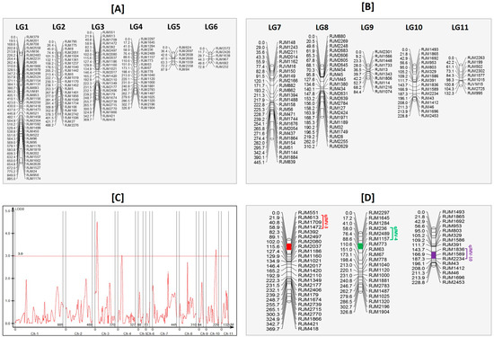 Figure 3. An interspecific genetic linkage map (A) LG1–LG6; (B) LG7–LG11 of Jatropha curcas based on an F2 mapping population generated by crossing J.curcas × J. integerrima. Estimates of map distances between markers are indicated in Kosambi centimorgans; (C) Whole genome scan of quantitative trait loci (QTLs) for Jatropha Mosaic Virus (JMV) resistance in Jatropha linkage maps. The X axis represents the distance in centimorgans (cM), and the Y axis depicts the logarithm of the odds (LOD) score. The red horizontal dotted line represents a significance LOD threshold value of 3.0; (D) Summary of three minor QTL locations detected in the genome of Jatropha. QTLs, represented by bars, are shown on the left side of the linkage groups.