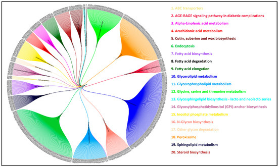 Figure 4. The 20 lipid metabolizing pathways and their components (as labelled 1–20), with the outer circle representing the individual RJCL genes that are involved in respective activities. In total, 693 lipid-metabolizing genes of RJC1 (RJCL: Jatropha Cultivar1 Lipid; RJCL1-RJCL693) are shown in outer-most circle.